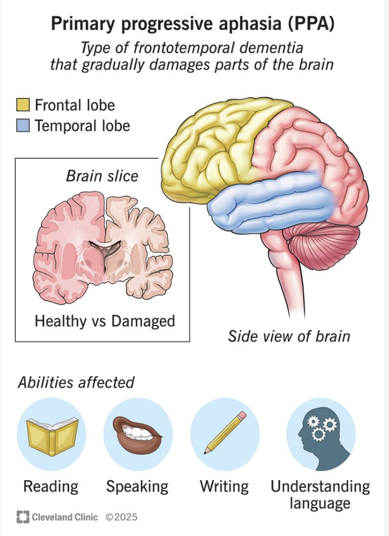 One form of dementia that has received more attention in recent years is Primary Progressive Aphasia (PPA) —> PPA is a type of Frontotemporal dementia and differs in significant ways from Alzheimer’s disease.